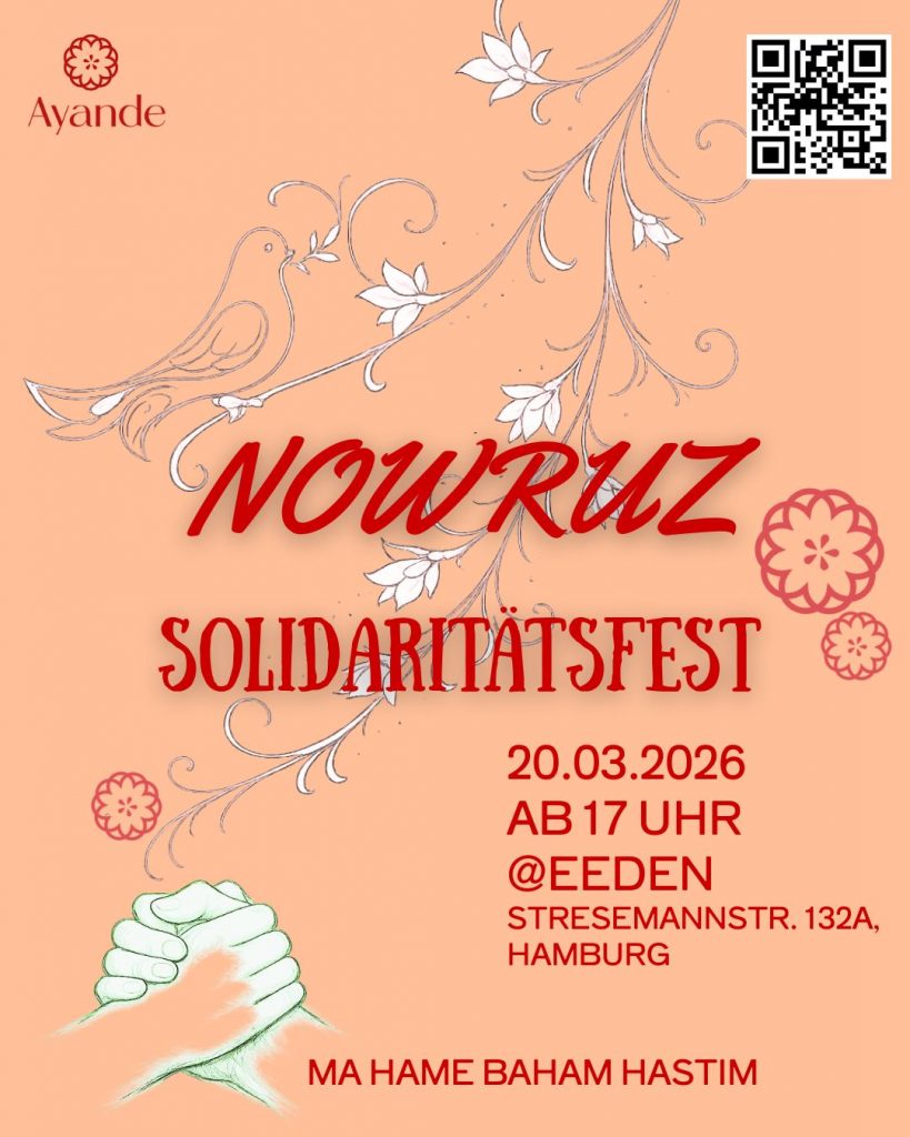 Das Neujahrsfest Nowruz steht bevor – und wir wollen es gemeinsam verbringen. Dieses Jahr möchten wir am 20.03.2026 ab 17 Uhr zu einem Solidaritätsfest in Hamburg zusammen kommen.